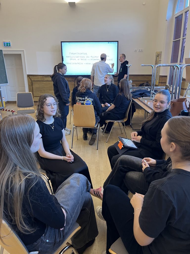 Der Kurs “Darstellen und Gestalten” des Jahrganges 11 hatte am heutigen 17. Dezember die Chance, gemeinsam mit Jonas Pawelski und Robert “Kalle” Wiechmann- zwei Darstellern aus dem Jugendtheater “Die Schotte” aus unserer Landeshauptstadt – einen Workshop zum Thema Forumtheater zu erleben und aktiv mitzugestalten. Aufgeschlossen, motiviert und unvoreingenommen gingen die Darstellenden ans Werk und erarbeiteten in 90 Minuten Unterrichtszeit Szenen und Rollen, die der Konfliktlösung in scheinbar festgefahrenen Alltagssituation gewidmet waren. Dabei wurden Szenen mehrfach wiederholt und Impulse aus dem Publikum aufgegriffen. Diese Form des Theaters geht auf den Brasilianer Augusto Boal zurück. Der Perspektivwechsel und das gemeinsame Entwickeln von Lösungen innerhalb der Zuschauerschaft stehen im Mittelpunkt und sind eine Methode, um jungen Menschen die Kompetenz zu vermitteln, Konflikte emphatisch und gewaltfrei zu lösen. Die Schülerinnen und Schüler des Kurses A27P1 wurden aktive Gestalter des Geschehens und die beiden Workshop Leiter und Frau Eichhorn als begleitende Fachlehrerin zeigten sich beeindruckt von den Ideen und dem Selbstbewusstsein der Akteure. Der Workshop wurde im Rahmen des Landesjugendförderplans 2023-2027 finanziert. Ein herzliches DANKE an Robert und Jonas vom Team der “Schotte” für diese Form, Theater zu erleben.