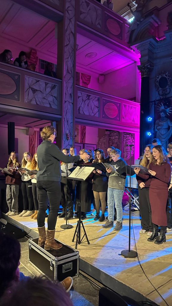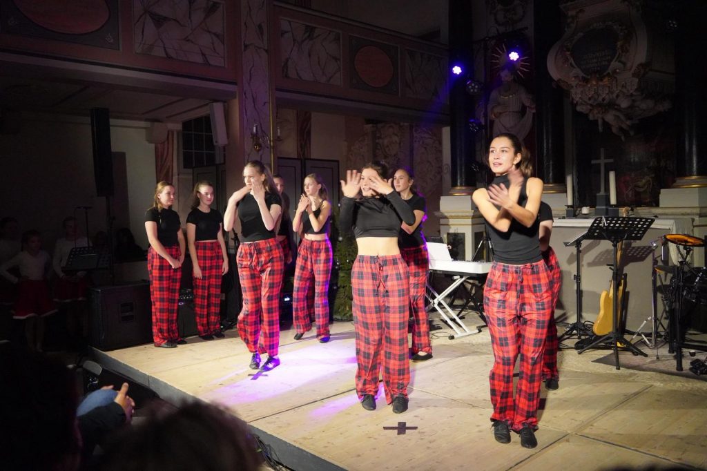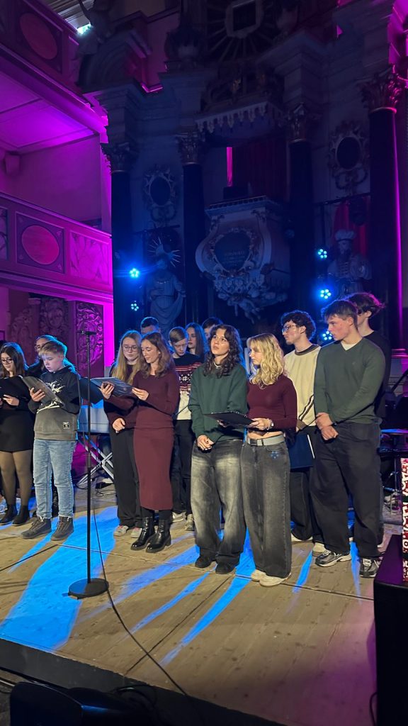 Der Andrang auf die Plätze in der Gottesackerkirche im Arboretum der Kurstadt war im Vorfeld so groß, dass man sich kurzerhand entschloss, ein Zusatzkonzert am späten Abend zu spielen. Die Kirche platzte zu beiden Veranstaltungen aus allen Nähten und die Akteurinnen und Akteure – ganz gleich ob SängerInnen, MusikerInnen, Tänzerinnen – ernteten so viel Applaus, dass er heute morgen noch einigen in den Ohren nachzuhallen schien. Müde aber stolze Schüleraugen strahlten heute mit dem Glanz der Weihnachtslichter im Schulhaus um die Wette. Besonders stolz auf ihre Schützlinge waren auch die Lehrerinnen und Lehrer, welche mit viel Herzblut dieses Konzert auf die Beine gestellt hatten und sogar selbst zu Instrument und Mikrophon griffen: Herr Schultz sang ein Silbermond-Solo begleitet von Frau Deiseroth an der Geige und Frau Obst am Klavier – Gänsehaut pur!