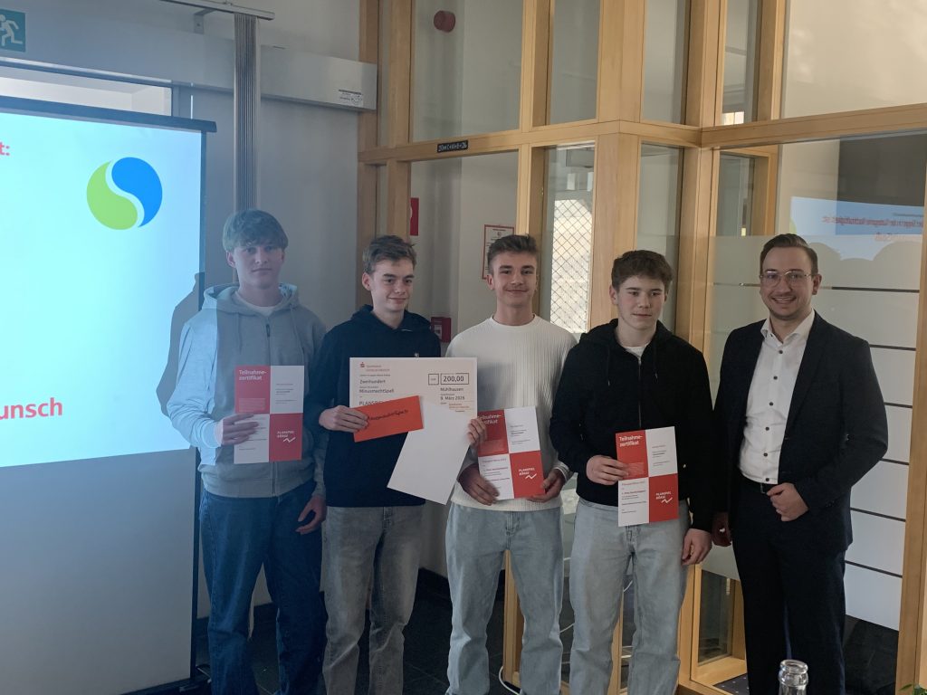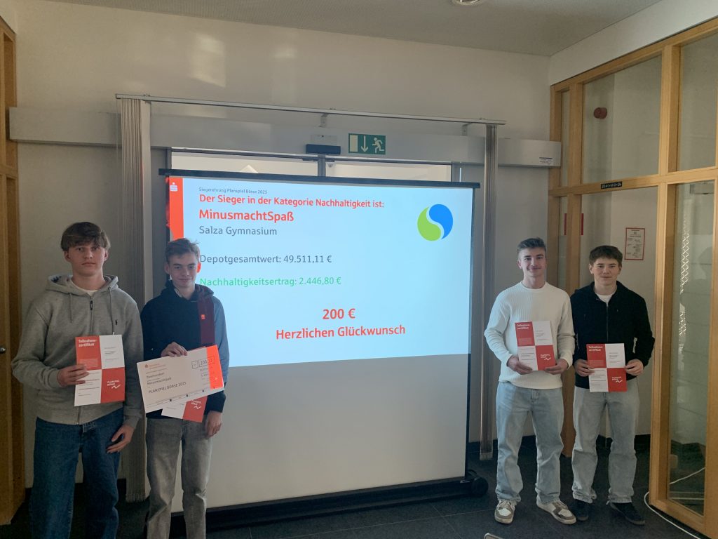 Auch in diesem Jahr belegt wieder ein Team aus der Stufe 10 den 1. Platz beim Planspiel Börse. Die Schüler Tim Hentrich, Jannes Michel, Adrian Richter und Hennig Keitel (Team “MinusMachtSpaß”) gewannen den Nachhaltigkeitswettbewerb beim Planspiel Börse der Sparkasse des Unstrut-Hainich-Kreises und bekamen bei der Siegerehrung in Mühlhausen eine Urkunde und ein Preisgeld überreicht. Von diesem hat das Team einen Teil an den Förderverein des Salza-Gymnasiums gespendet und stellvertretend dem Schulleiter Herrn Eltahir übergeben. Auch dies ist wieder ein absolut nachhaltiges Investment. Danke Tim, Jannes, Adrian und Henning!
