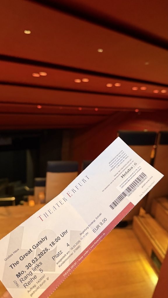 Das dritte Jahr in Folge machten sich Schülerinnen und Schüler der Oberstufenkurse Englisch auf den Weg in das Theater nach Erfurt. Nach den Stücken „1984“ und „Martin Luther King“ gab es in diesem Jahr die Möglichkeit, einen der Klassiker der amerikanischen Literatur in englischer Sprache auf der Bühne zu sehen: „The Great Gatsby“ geschrieben von F. Scott Fitzgerald, wurde von der „American Drama Group“ am Montag, den 30. März, auf den Brettern, die die Welt bedeuten, inszeniert. Es war beeindruckend mitzuerleben, wie nur fünf Schauspieler ein solch komplexes Werk mit allerhand Requisiten und ständig wechselnden Kostümen auf eine solch abwechslungsreiche und unterhaltsame Art auf die Bühne bringen konnten.